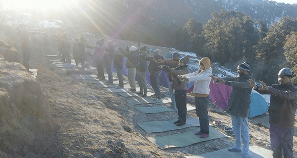 Distance covered: 90kms from Dehradun to Pantwari; 5.5 km trek to campsite Trekking duration: 4 hours to reach Pantwari; 4-5 hours to reach campsite The journey begins at 7AM from the Dehradun bus stand. The drive to Pantwari (approximately 90kms) takes around 3-4 hours to cover, gaining an altitude of about 1400 m. We will be driving through the Queen of hills – Mussoorie and passing by the lovely Kempty Falls along the way. Swift mountain streams run parallel to the roads in many sections. Although the journey is a charming one to behold, the roads can be rather coiled with sharp turns and steep climbs. After crossing Mussoorie, the roads become emptier, the gorges on the sides seem bottomless and the mountains more rugged & lofty. We will be taking a quick halt on the way to freshen up and have breakfast. Expect to be at Pantwari, the starting point, by 11 am. We will begin our trek to Nag Mandir as soon as we reach here. Packed lunches will be provided for this day. The trail to the Nag Mandir campsite stretches over 5.5 kms and will take approximately 4-5 hours to cover. It begins with 2 kms of an uphill trudge on a cemented path that goes through the village market. Soon this path translates to a rocky uneven trail. All along, one can enjoy the mesmerising views of the layered mountains, the small village of Pantwari lying down in the valley below & patches of farmlands on the way. The next 1-1.5kms is a dry and narrow shepherd’s trail with gradual ascents and descents. After this the trail nosedives into a dense canopy of Oak and Rhododendron forests that allows only a little sunlight in. The red and pink flowers of the rhododendrons don’t bloom in the winters. The path inside the forest can be snow-laden in some sections. After trekking for 1 km, the forest finally opens up to a small patch of land. A structure of a temple sits at the heart of this clearing. This is the famous Nag Mandir. We will be setting up camp here for the day. The campsite offers panoramic views of a snow-covered Himalayan range at the horizon (on clear days). Tip: The sunsets and starlit night skies are lovely at this campsite. The temperatures can dip down to -7 degrees in the winters. So please ensure you are layered well. Note: In the winters, when the snow is heavy, we may set up camp at Khatian; a camping ground 2kms before Nag Mandir.